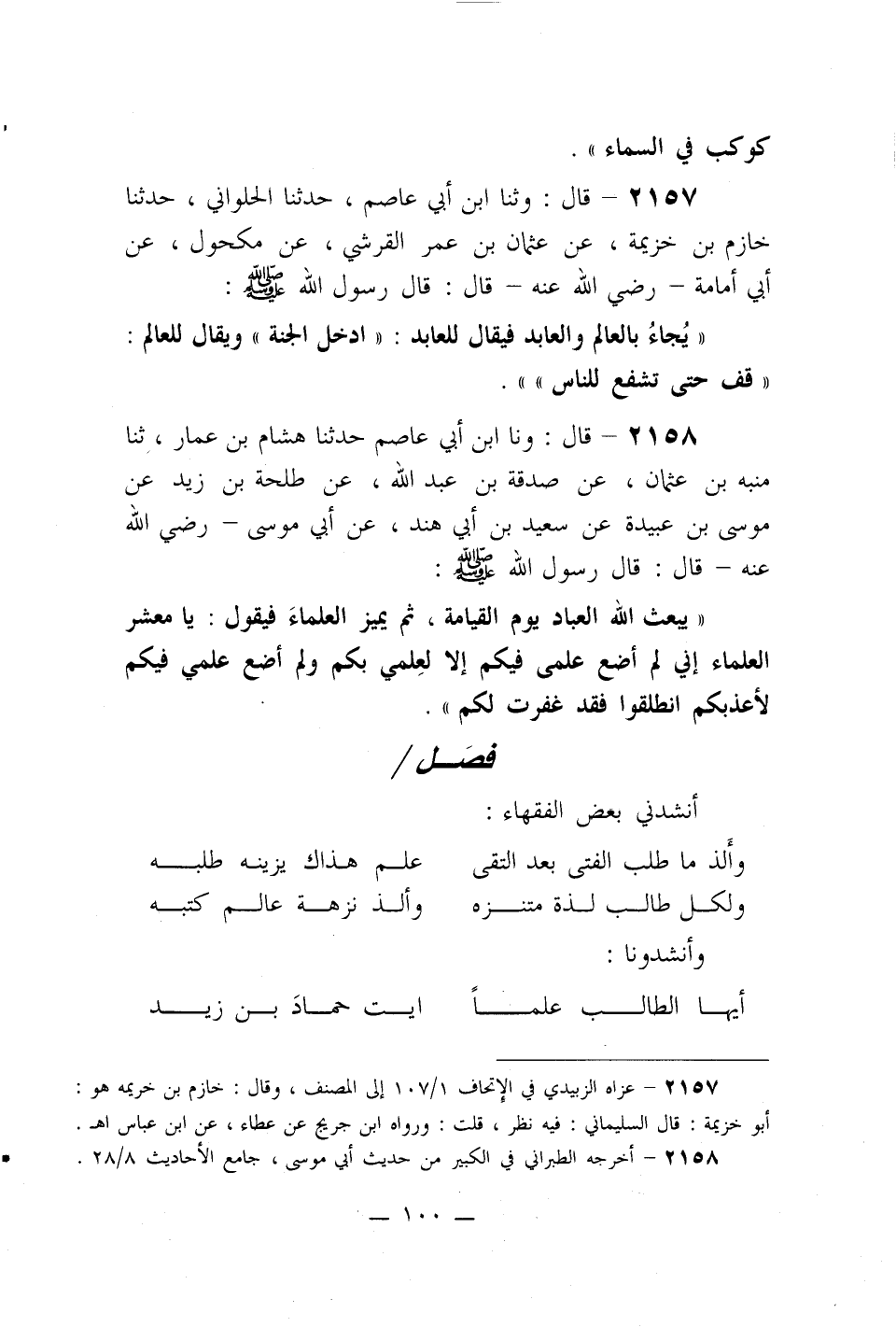 2157- قال: وثنا ابن أبي عاصم، حدثنا الحلواني، حدثنا خازم بن خزيمة، عن عثمان بن عمر القرشي، عن مكحول، عن أبي أمامة -رضي الله عنه- قال: قال رسول الله صلى الله عليه وسلم: