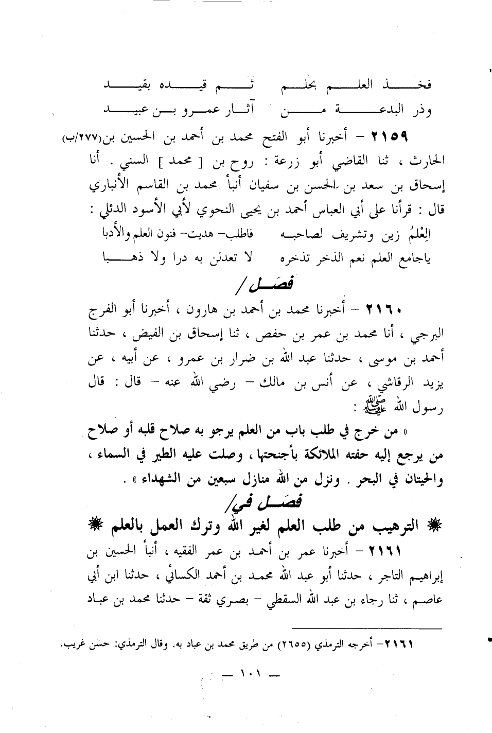 2159- أخبرنا أبو الفتح محمد بن أحمد بن الحسين بن الحارث، ثنا القاضي أبو زرعة: روح بن [محمد] السني. أنا إسحاق بن سعد بن الحسن بن سفيان أنبأ محمد بن القاسم الأنباري قال: قرأنا على أبي العباس أحمد بن يحيى النحوي لأبي الأسود الدؤلي: