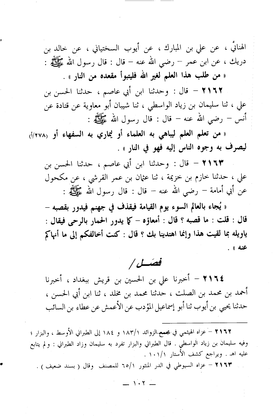 2163- قال: وحدثنا ابن أبي عاصم، حدثنا الحسن بن علي، حدثنا خازم بن خزيمة، ثنا عثمان بن عمر القرشي، عن مكحول عن أبي أمامة –رضي الله عنه- قال: قال رسول الله صلى الله عليه وسلم: