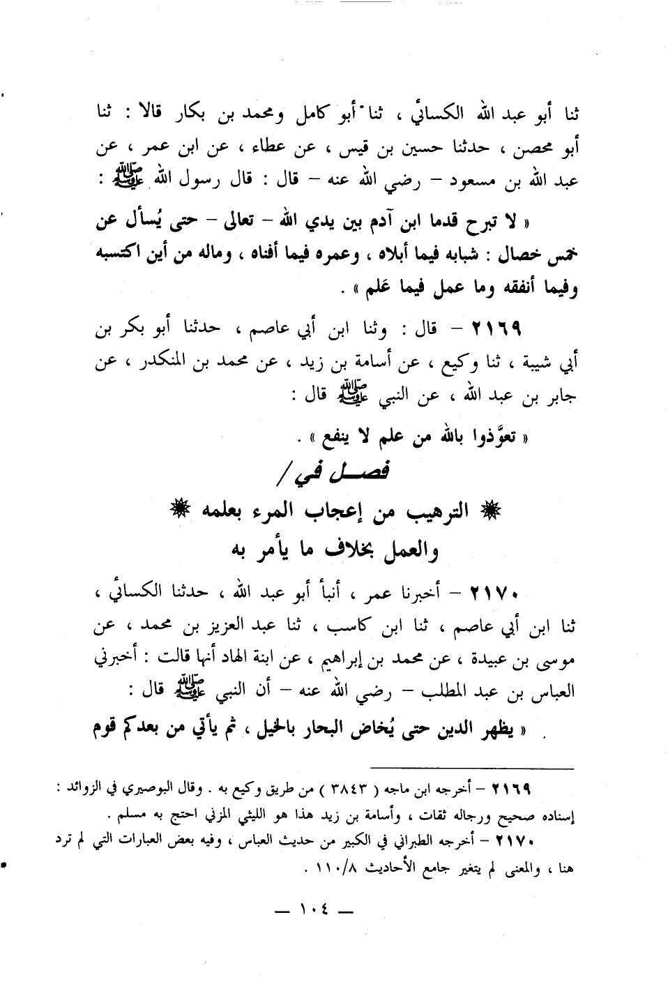 2170- أخبرنا عمر، أنبأ أبو عبد الله، حدثنا الكسائي، ثنا ابن أبي عاصم، ثنا ابن كاسب، ثنا عبد العزيز بن محمد، عن موسى بن عبيدة، عن محمد بن إبراهيم، عن ابنة الهاد أنها قالت: أخبرني العباس بن عبد المطلب –رضي الله عنه- أن النبي صلى الله عليه وسلم قال: