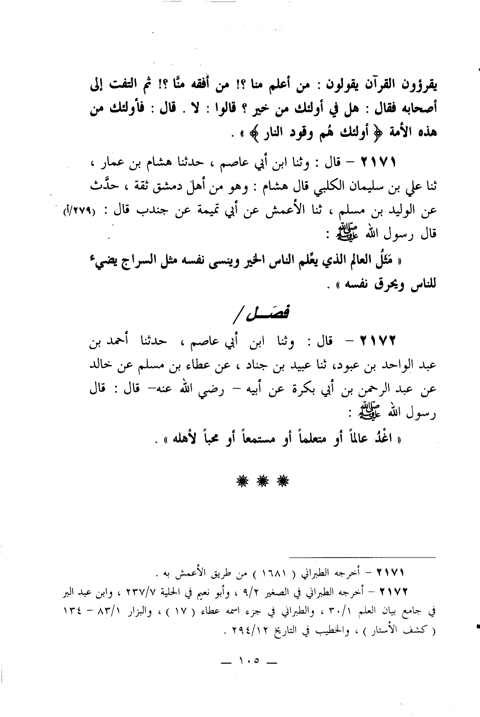 2171- قال: وثنا ابن أبي عاصم، حدثنا هشام بن عمار، ثنا علي بن سليمان الكلبي قال هشام: وهو من أهل دمشق ثقة، حدث عن الوليد بن مسلم، ثنا الأعمش عن أبي تميمة بن جندب قال: قال رسول الله صلى الله عليه وسلم: