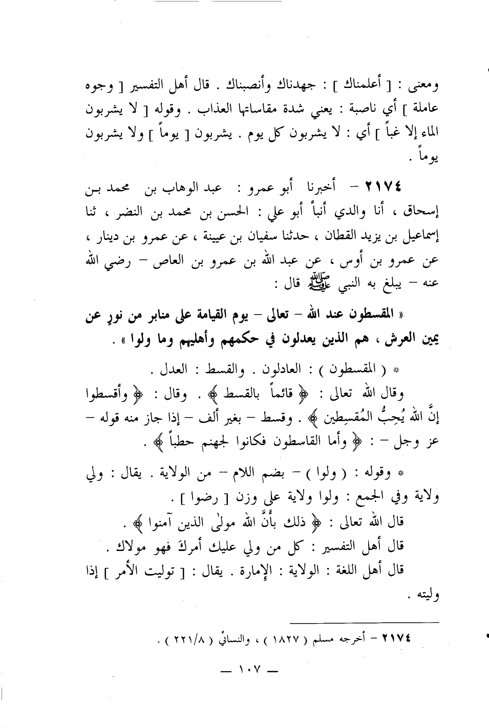 2174- أخبرنا أبو عمرو: عبد الوهاب بن محمد بن إسحاق، أنا والدي أنبأ أبو علي: الحسن بن محمد بن النضر، ثنا إسماعيل بن يزيد القطان، حدثنا سفيان بن عيينة، عن عمرو بن دينار، عن عمرو بن أوس، عن عبد الله بن عمرو بن العاص –رضي الله عنه- يبلغ به النبي صلى الله عليه وسلم قال: