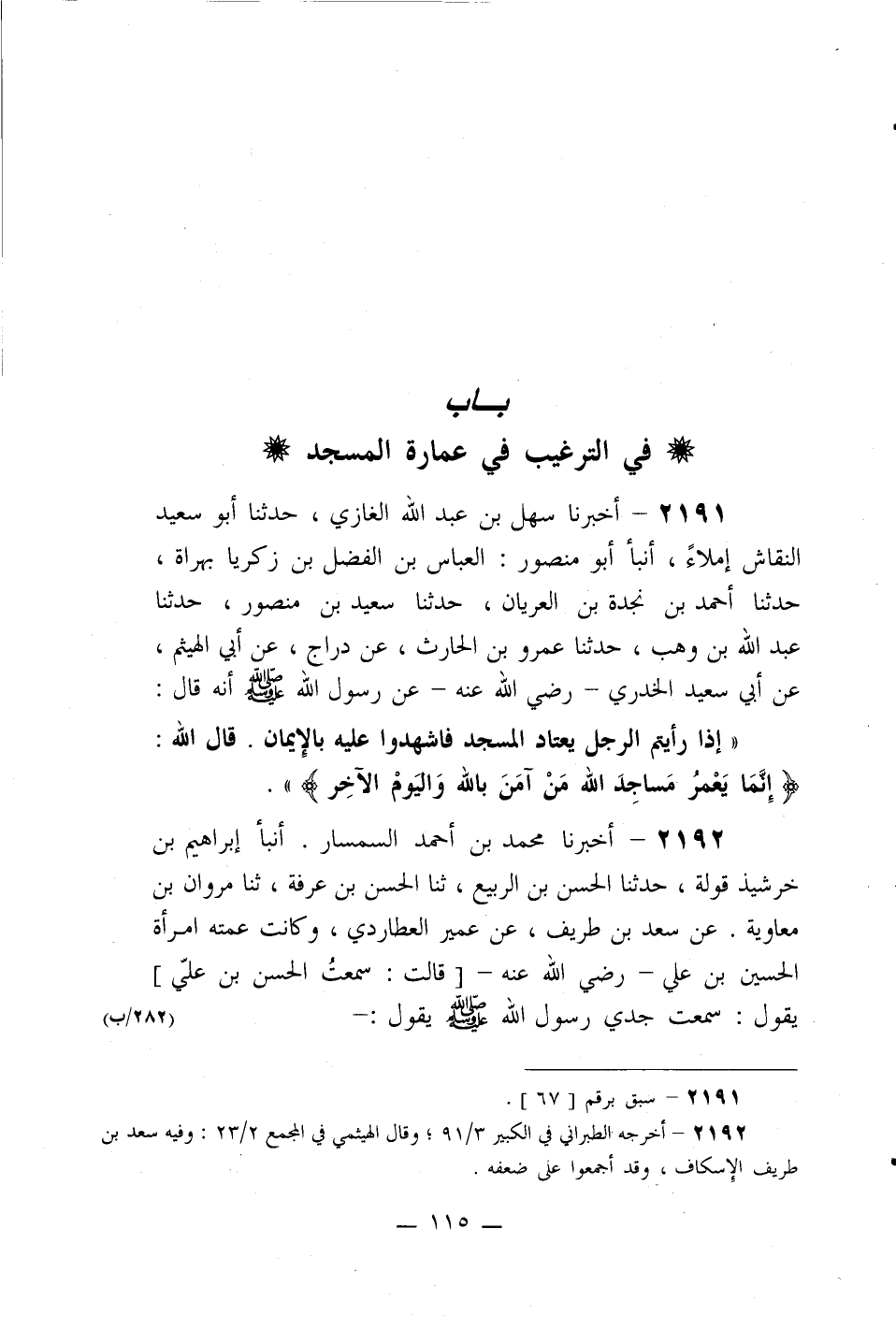 2191- أخبرنا سهل بن عبد الله الغازي، حدثنا أبو سعيد النقاش إملاءً، أنبأ أبو منصور: العباس بن الفضل بن زكريا بهراة، حدثنا أحمد بن نجدة بن العريان، حدثنا سعيد بن منصور، حدثنا عبد الله بن وهب، حدثنا عمرو بن الحارث، عن دراج، عن أبي الهيثم، عن أبي سعيد الخدري –رضي الله عنه- عن رسول الله صلى الله عليه وسلم أنه قال: