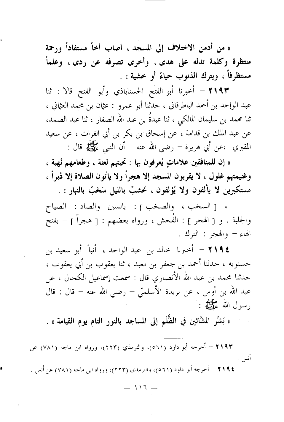 2194- أخبرنا خالد بن عبد الواحد، أنبأ أبو سعيد بن حسنويه، حدثنا أحمد بن جعفر بن معبد، ثنا يعقوب بن أبي يعقوب، حدثنا محمد بن عبد الله الأنصاري قال: سمعت إسماعيل الكحال، عن عبد الله بن أوس، عن بريدة الأسلمي –رضي الله عنه- قال: قال رسول الله صلى الله عليه وسلم: