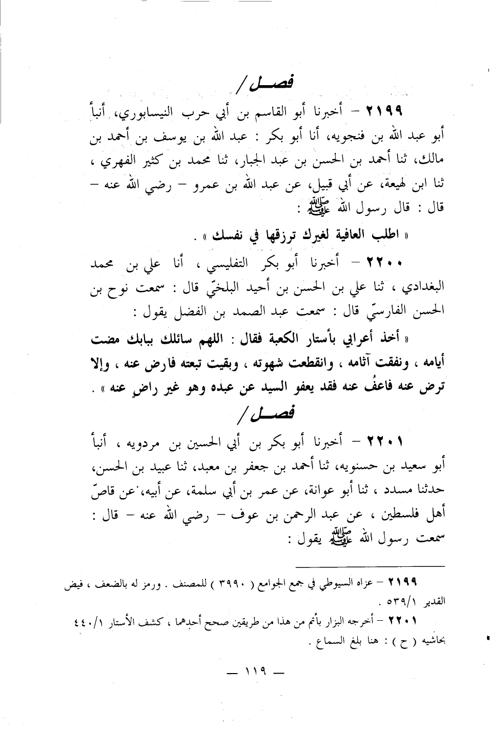 2201- أخبرنا أبو بكر بن أبي الحسين بن مردويه، أنبأ أبو سعيد بن حسنويه، ثنا أحمد بن جعفر بن معبد، ثنا عبيد بن الحسن، حدثنا مسدد، ثنا أبو عوانة، عن عمر بن أبي سلمة، عن أبيه، عن قاص أهل فلسطين، عن عبد الرحمن بن عوف –رضي الله عنه- قال: سمعت رسول الله صلى الله عليه وسلم يقول: