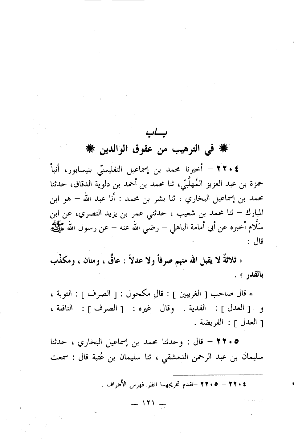 2204- أخبرنا محمد بن إسماعيل التفليسي بنيسابور، أنبأ حمزة بن عبد العزيز المهلبي، ثنا محمد بن أحمد بن دلوية الدقاق، حدثنا محمد بن إسماعيل البخاري، ثنا بشر بن محمد: أنا عبد الله –هو ابن المبارك- ثنا محمد بن شعيب، حدثني عمر بن يزيد النصري، عن ابن سلام أخبره عن أبي أمامة الباهلي –رضي الله عنه- عن رسول الله صلى الله عليه وسلم قال: