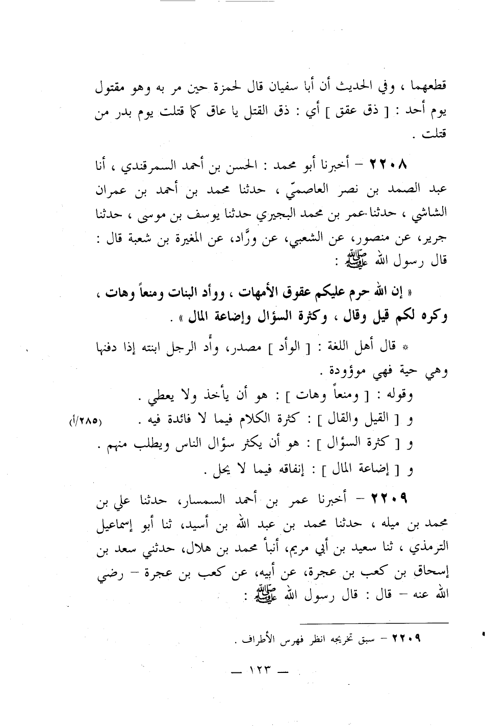 2208- أخبرنا أبو محمد: الحسن بن أحمد السمرقندي، أنا عبد الصمد بن نصر العاصمي، حدثنا محمد بن أحمد بن عمران الشاشي، حدثنا عمر بن محمد البجيري حدثنا يوسف بن موسى، حدثنا جرير، عن منصور، عن الشعبي، عن وراد، عن المغيرة بن شعبة قال: قال رسول الله صلى الله عليه وسلم: