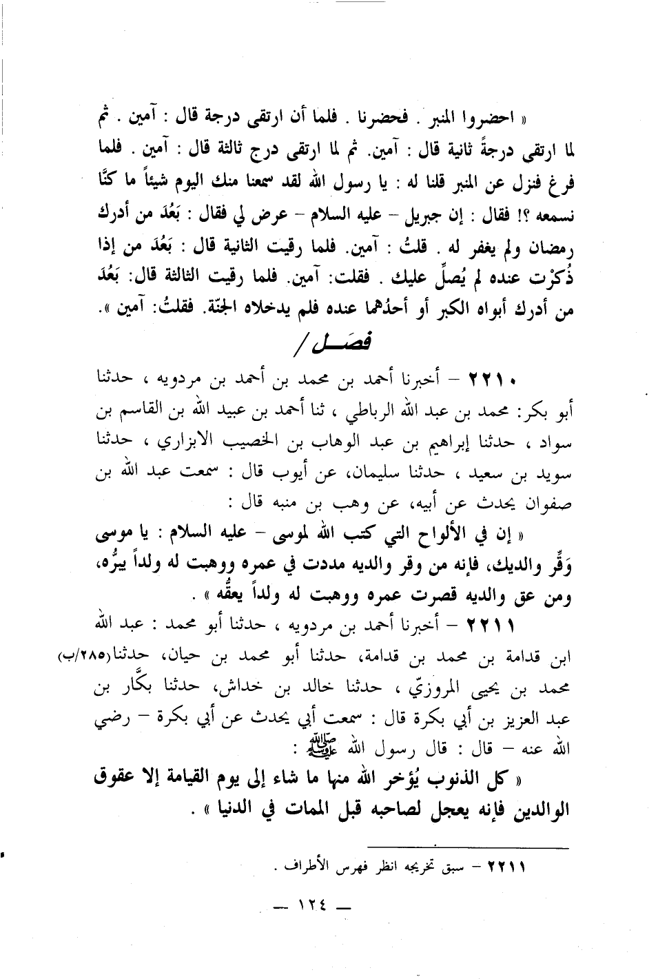 2211- أخبرنا أحمد بن مردويه، حدثنا أبو محمد: عبد الله بن قدامة بن محمد بن قدامة، حدثنا أبو محمد بن حيان، حدثنا محمد بن يحيى المروزي، حدثنا خالد بن خداش، حدثنا بكار بن عبد العزيز بن أبي بكرة قال: سمعت أبي يحدث عن أبي بكرة –رضي الله عنه- قال: قال رسول الله صلى الله عليه وسلم: