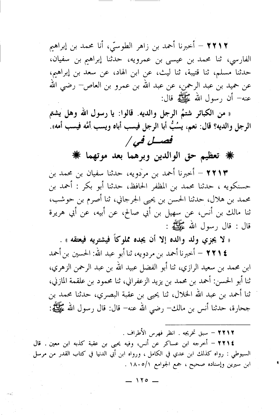 2212- أخبرنا أحمد بن زاهر الطوسي، أنا محمد بن إبراهيم الفارسي، ثنا محمد بن عيسى بن عمرويه، حدثنا إبراهيم بن سفيان، حدثنا مسلم، ثنا قتيبة، ثنا ليث، عن ابن الهاد، عن سعد بن إبراهيم، عن حميد بن عبد الرحمن، عن عبد الله بن عمرو بن العاص –رضي الله عنه- أن رسول الله صلى الله عليه وسلم قال: