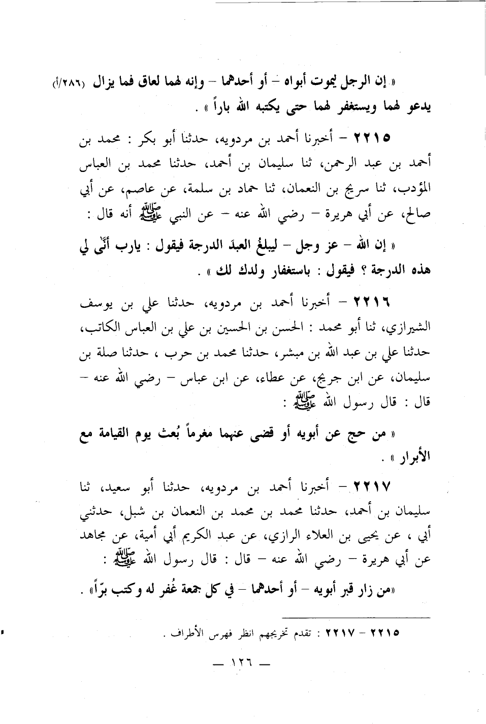 2215- أخبرنا أحمد بن مردويه، حدثنا أبو بكر: محمد بن أحمد بن عبد الرحمن، ثنا سليمان بن أحمد، حدثنا محمد بن العباس المؤدب، ثنا سريج بن النعمان، ثنا حماد بن سلمة، عن عاصم، عن أبي صالح، عن أبي هريرة –رضي الله عنه- عن النبي صلى الله عليه وسلم أنه قال: