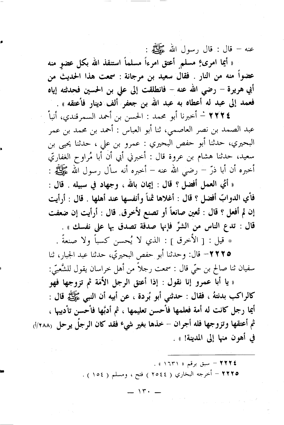 ((يا أبا عمرو إنا نقول: إذا أعتق الرجل الأمة ثم تزوجها فهو كالراكب بدنته، فقال: حدثني أبو بردة، عن أبيه أن النبي صلى الله عليه وسلم قال: أيما رجل كانت له أمة فعلمها فأحسن تعليمها، ثم أدبها فأحسن تأديبها، ثم أعتقها وتزوجها فله أجران – خذها بغير شيء فقد كان الرجل يرحل في أهون منها إلى المدينة!)) .