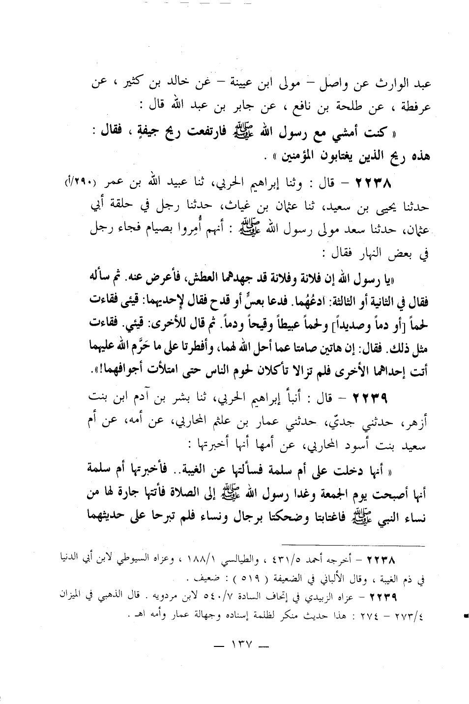 2239- قال: أنبأ إبراهيم الحربي، ثنا بشر بن آدم ابن بنت أزهر، حدثني جدي، حدثني عمار بن علثم المحاربي، عن أمه، عن أم سعيد بنت أسود المحاربي، عن أمها أنها أخبرتها: