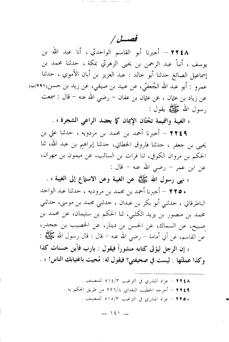 2250- أخبرنا أحمد بن محمد بن مردويه، حدثنا عبد الواحد الباطرقاني، حدثني أبو بكر بن عبدان، حدثني محمد بن موسى، حدثني محمد بن منصور بن يزيد الكلبي، ثنا الحكم بن سليمان، عن محمد بن صبيح، عن السماك، عن الحسن بن دينار، عن الخصيب بن جحدر، عن القاسم، عن أبي أمامة –رضي الله عنه- قال: قال رسول الله صلى الله عليه وسلم: