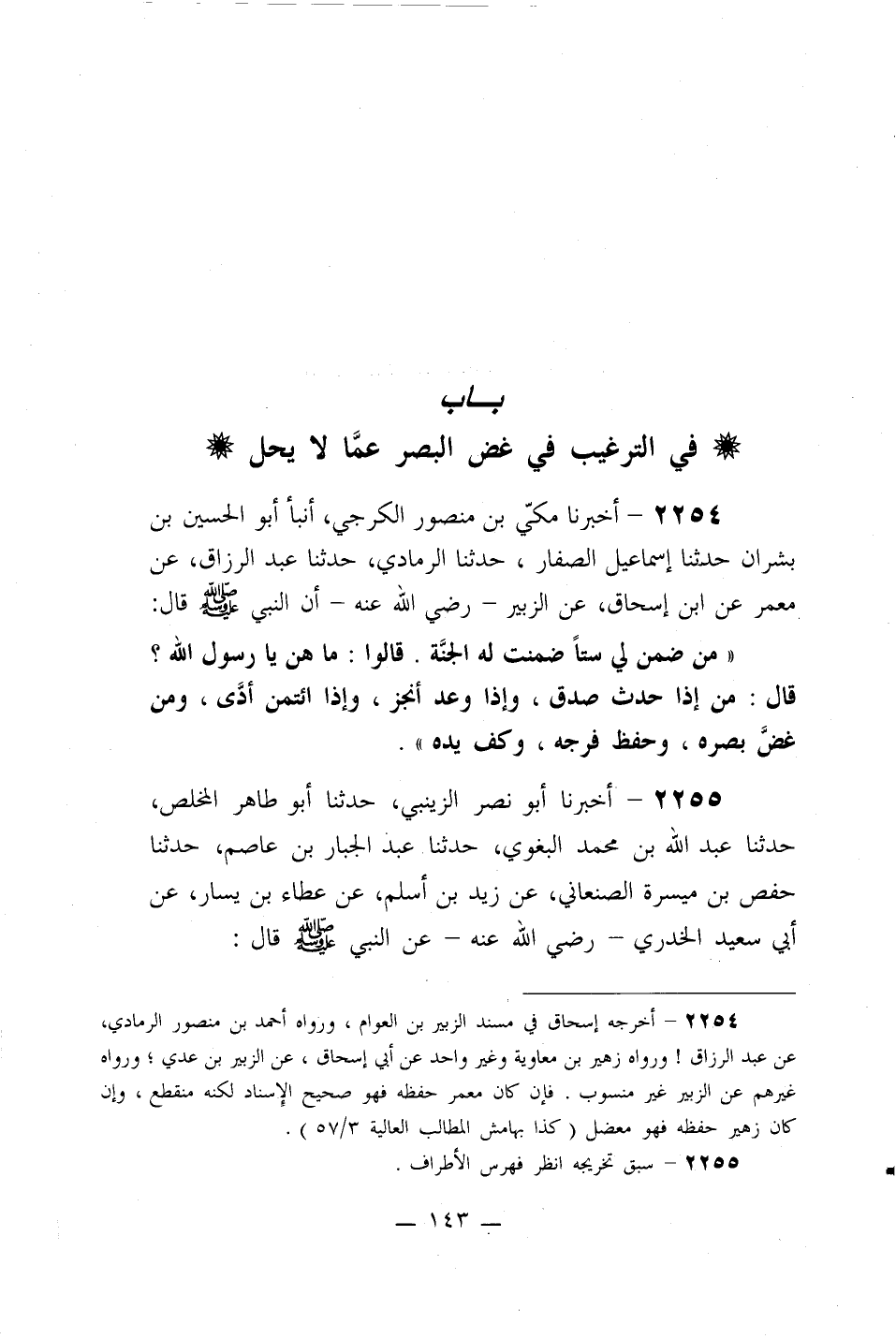 2255- أخبرنا أبو نصر الزينبي، حدثنا أبو طاهر المخلص، حدثنا عبد الله بن محمد البغوي، حدثنا عبد الجبار بن عاصم، حدثنا حفص بن ميسرة الصنعاني، عن زيد بن أسلم، عن عطاء بن يسار، عن أبي سعيد الخدري –رضي الله عنه- عن النبي صلى الله عليه وسلم قال:
