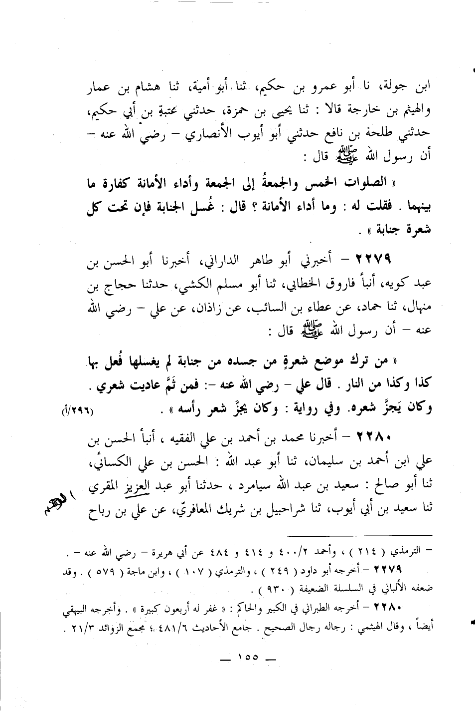 2279- أخبرني أبو طاهر الداراني، أخبرنا أبو الحسن بن عبدكويه، أنبأ فاروق الخطابي، ثنا أبو مسلم الكشي، حدثنا حجاج بن منهال، ثنا حماد، عن عطاء بن السائب، عن زاذان، عن علي –رضي الله عنه- أن رسول الله صلى الله عليه وسلم قال: