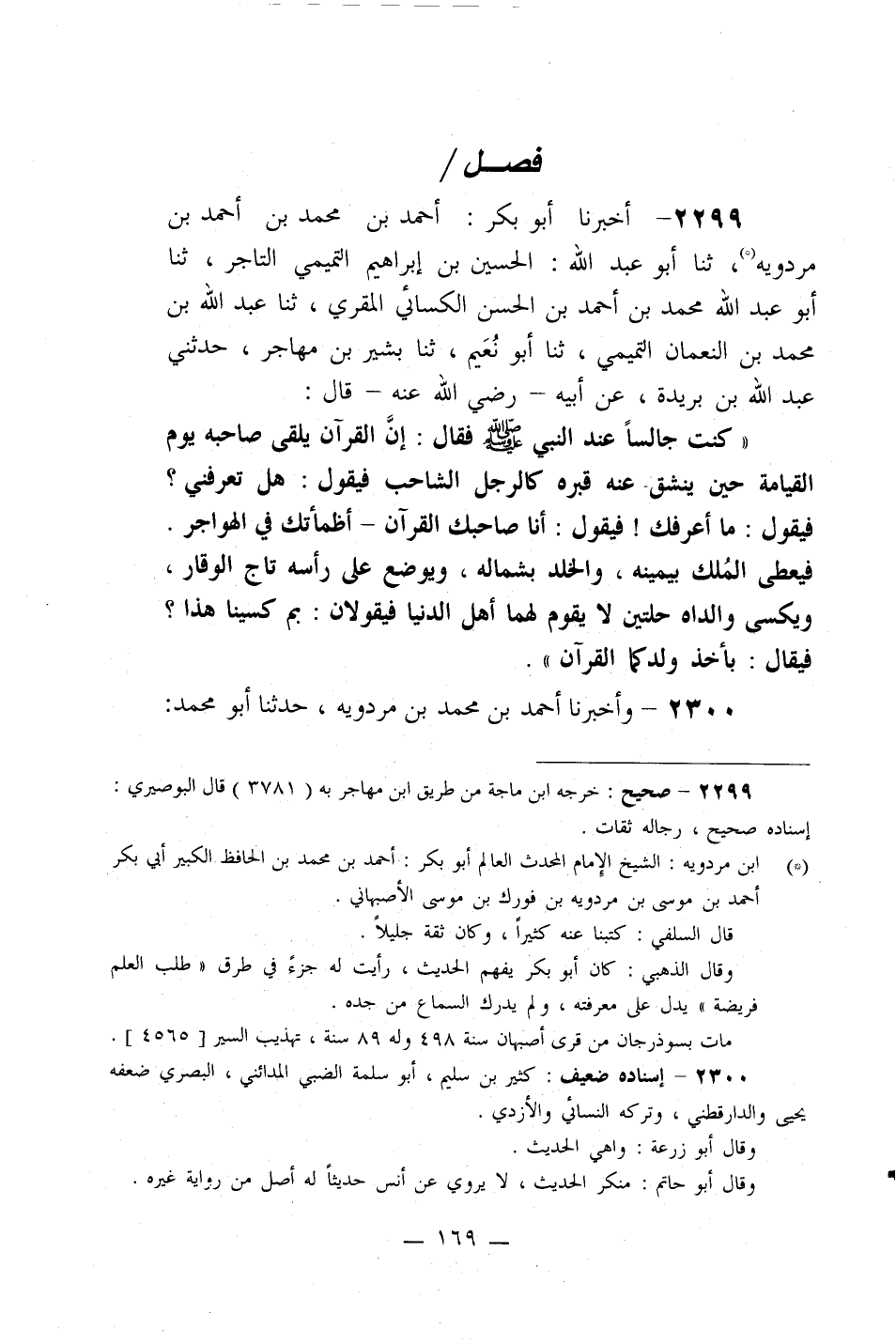 2299- أخبرنا أبو بكر: أحمد بن محمد بن أحمد بن مردويه، ثنا أبو عبد الله: الحسين بن إبراهيم التميمي التاجر، ثنا أبو عبد الله محمد بن أحمد بن الحسن الكسائي المقري، ثنا عبد الله بن محمد بن النعمان التميمي، ثنا أبو نعيم، ثنا بشير بن مهاجر، حدثني عبد الله بن بريدة، عن أبيه –رضي الله عنه- قال: