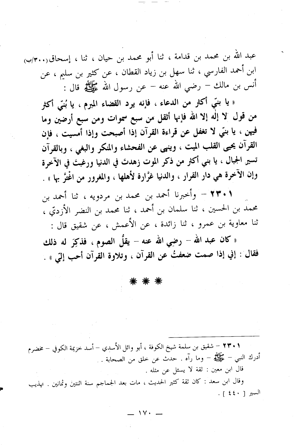 2301- وأخبرنا أحمد بن محمد بن مردويه، ثنا أحمد بن محمد بن الحسين، ثنا سلمان بن أحمد، ثنا محمد بن النضر الأزدي، ثنا معاوية بن عمرو، ثنا زائدة، عن الأعمش، عن شقيق قال: