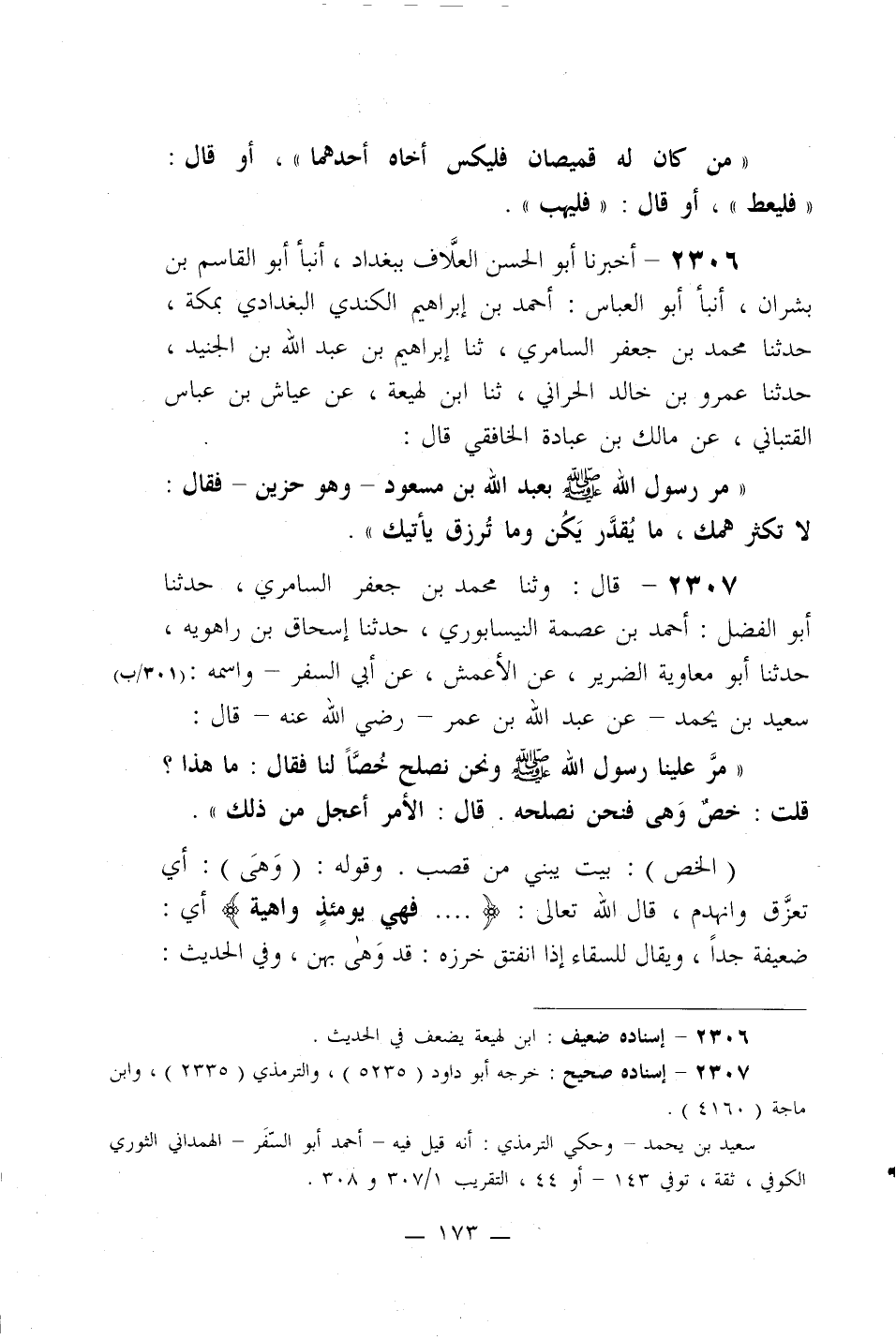 2307- قال: وثنا محمد بن جعفر السامري، حدثنا أبو الفضل: أحمد بن عصمة النيسابوري، حدثنا إسحاق بن راهويه، حدثنا أبو معاوية الضرير، عن الأعمش، عن أبي السفر –واسمه: سعيد بن يحمد- عن عبد الله بن عمر –رضي الله عنه- قال: