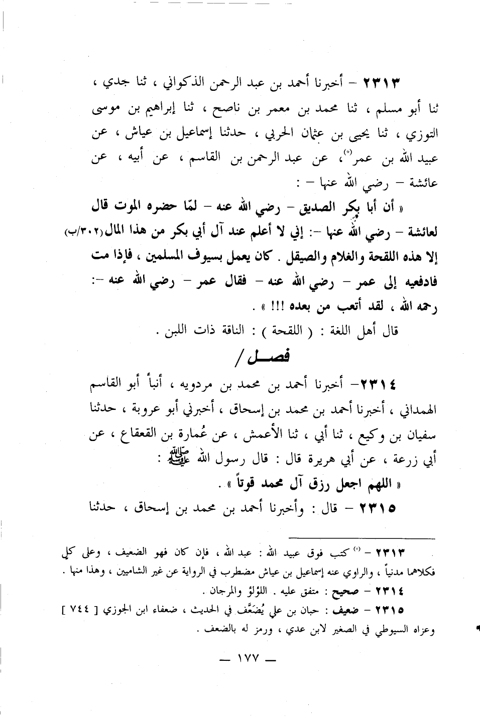 2313- أخبرنا أحمد بن عبد الرحمن الذكواني، ثنا جدي، ثنا أبو مسلم، ثنا محمد بن معمر بن ناصح، ثنا إبراهيم بن موسى التوزي، ثنا يحيى بن عثمان الحربي، حدثنا إسماعيل بن عياش، عن عبيد الله بن عمر، عن عبد الرحمن بن القاسم، عن أبيه، عن عائشة –رضي الله عنها-: