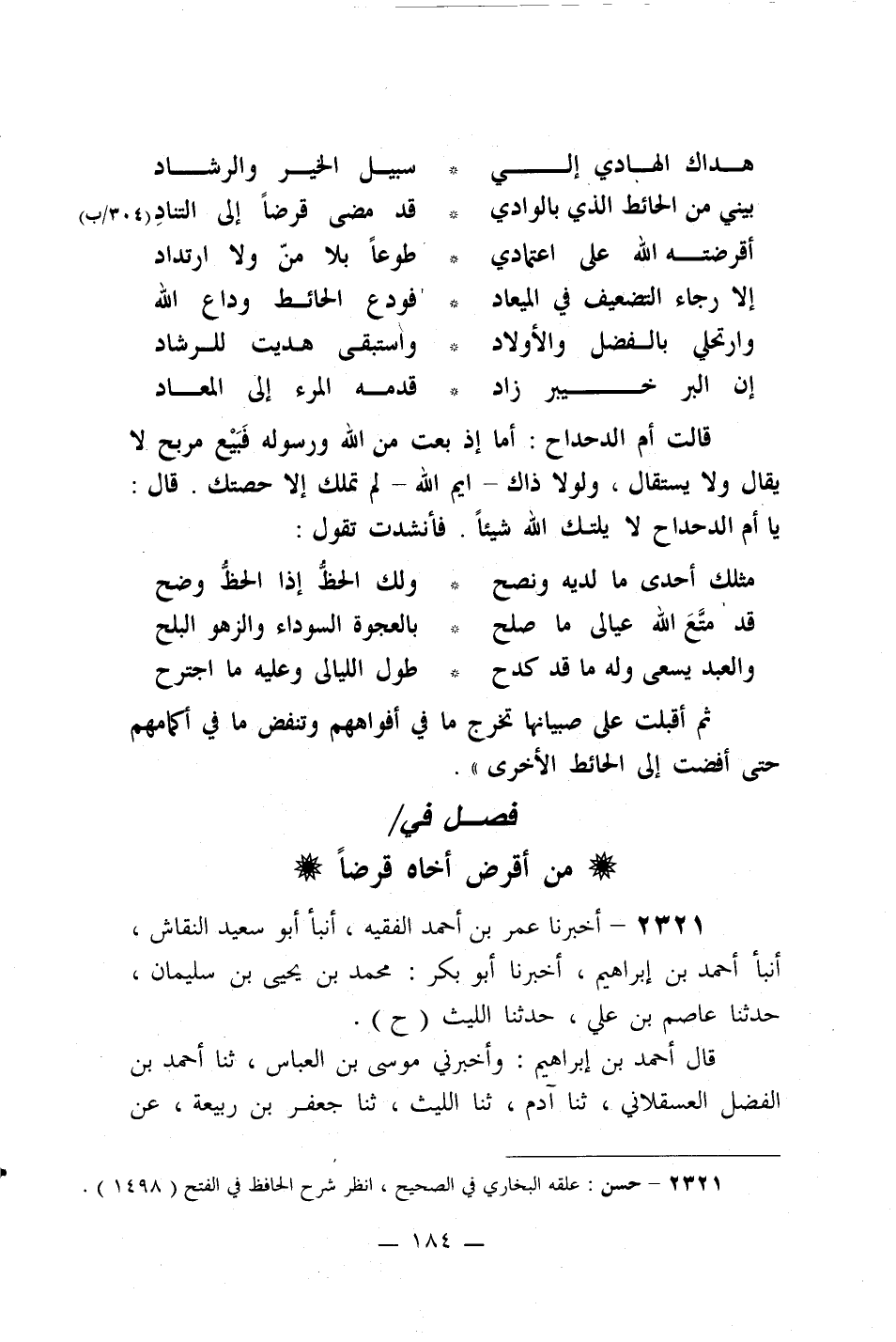 2321- أخبرنا عمر بن أحمد الفقيه، أنبأ أبو سعيد النقاش، أنبأ أحمد بن إبراهيم، أخبرنا أبو بكر: محمد بن يحيى بن سليمان، حدثنا عاصم بن علي، حدثنا الليث (ح) .