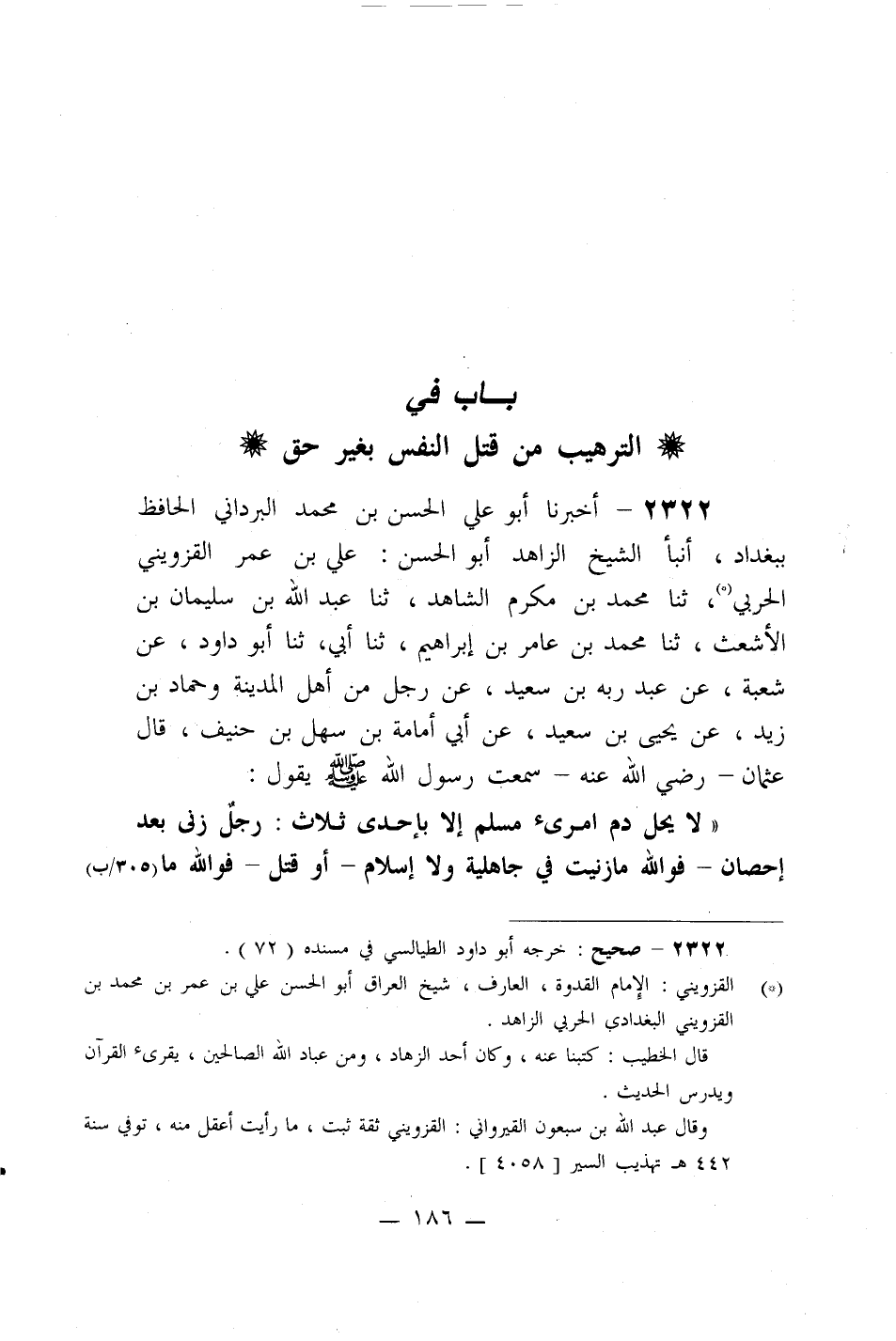 ((لا يحل دم امرئ مسلم إلا بإحدى ثلاث: رجلٌ زنى بعد إحصان -فوالله ما زنيت في جاهلية ولا إسلام- أو قتل -فوالله ما -[187]- قتلت- ورجل كفر بعد إسلامه -فوالله ما ابتغيت بديني بدلاً-)) .