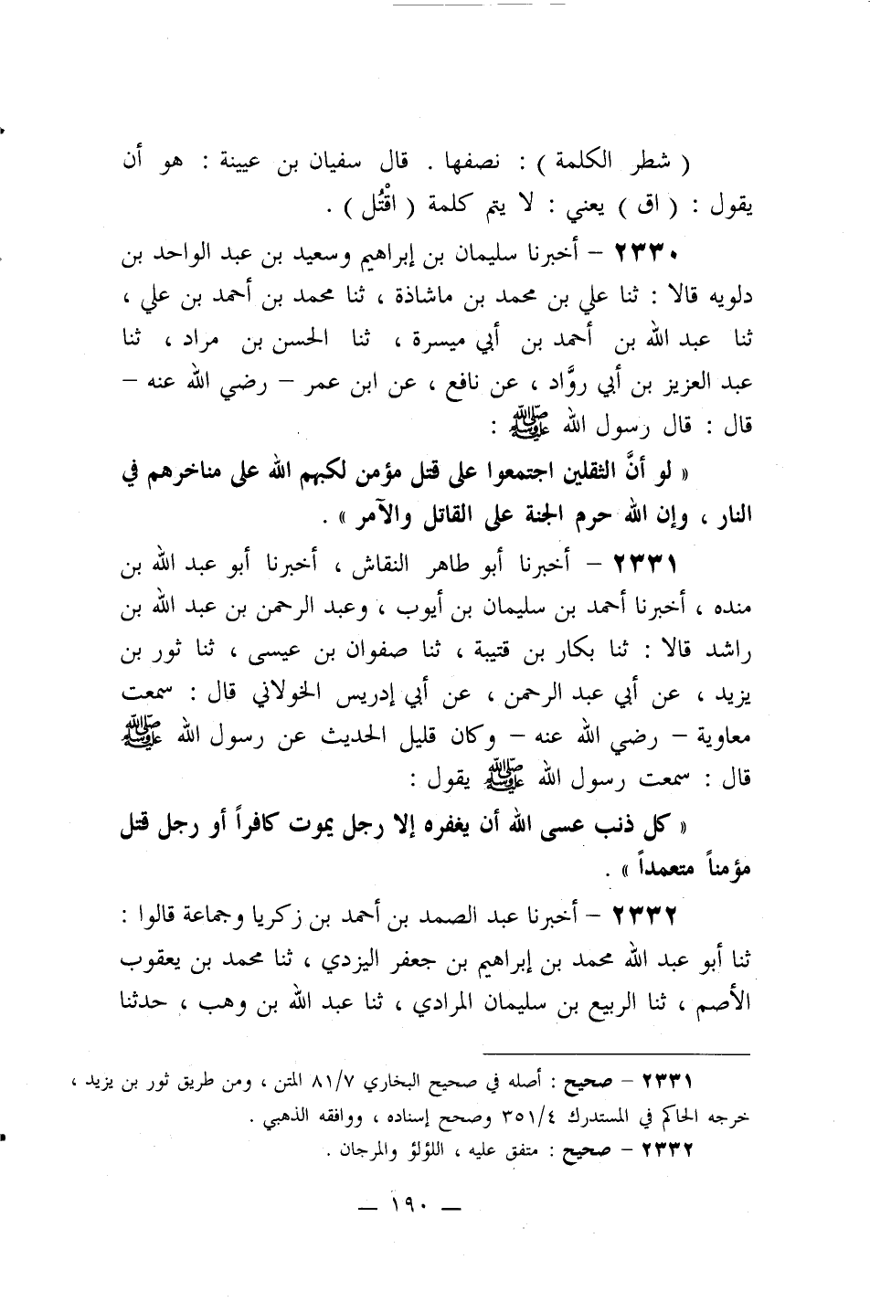 2330- أخبرنا سليمان بن إبراهيم وسعيد بن عبد الواحد بن دلويه قالا: ثنا علي بن محمد بن ماشاذة، ثنا محمد بن أحمد بن علي، ثنا عبد الله بن أحمد بن أبي ميسرة، ثنا الحسن بن مراد، ثنا عبد العزيز بن أبي رواد، عن نافع، عن ابن عمر -رضي الله عنه- قال: قال رسول الله صلى الله عليه وسلم: