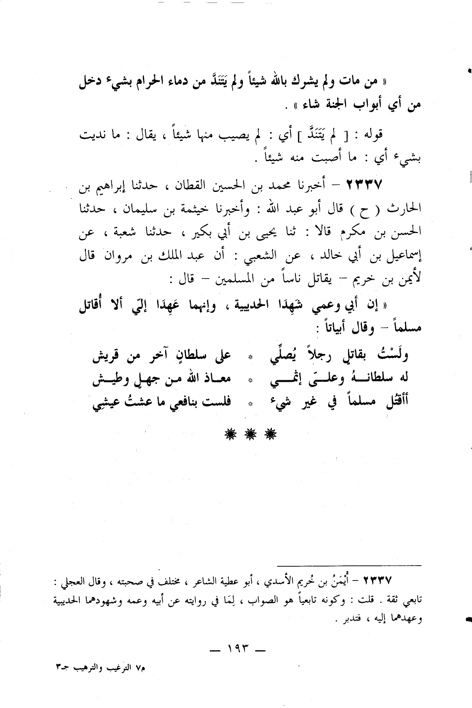 2337- أخبرنا محمد بن الحسين القطان، حدثنا إبراهيم بن الحارث (ح) قال أبو عبد الله: وأخبرنا خيثمة بن سليمان، حدثنا الحسن بن مكرم قالا: ثنا يحيى بن أبي بكير، حدثنا شعبة، عن إسماعيل بن أبي خالد، عن الشعبي: أن عبد الملك بن مروان قال لأيمن بن خريم -يقاتل ناساً من المسلمين- قال: