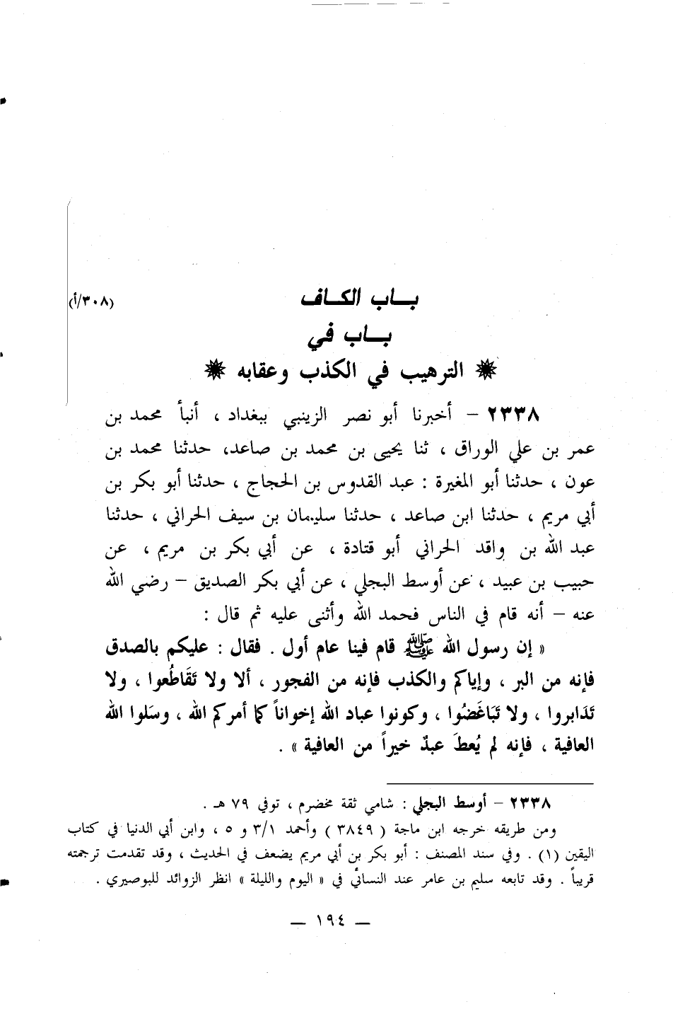 2338- أخبرنا أبو نصر الزينبي ببغداد، أنبأ محمد بن عمر بن علي الوراق، ثنا يحيى بن محمد بن صاعد، حدثنا محمد بن عون، حدثنا أبو المغيرة: عبد القدوس بن الحجاج، حدثنا أبو بكر بن أبي مريم، حدثنا ابن صاعد، حدثنا سليمان بن سيف الحراني، حدثنا عبد الله بن واقد الحراني أبو قتادة، عن أبي بكر بن مريم، عن حبيب بن عبيد، عن أوسط البجلي، عن أبي بكر الصديق -رضي الله عنه- أنه قام في الناس فحمد الله وأثنى عليه ثم قال: