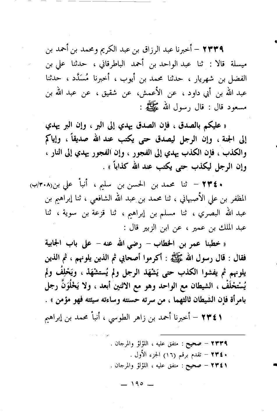 2339- أخبرنا عبد الرزاق بن عبد الكريم ومحمد بن أحمد بن ميسلة قالا: ثنا عبد الواحد بن أحمد الباطرقاني، حدثنا علي بن الفضل بن شهريار، حدثنا محمد بن أيوب، أخبرنا مسدد، حدثنا عبد الله بن أبي داود، عن الأعمش، عن شقيق، عن عبد الله بن مسعود قال: قال رسول الله صلى الله عليه وسلم: