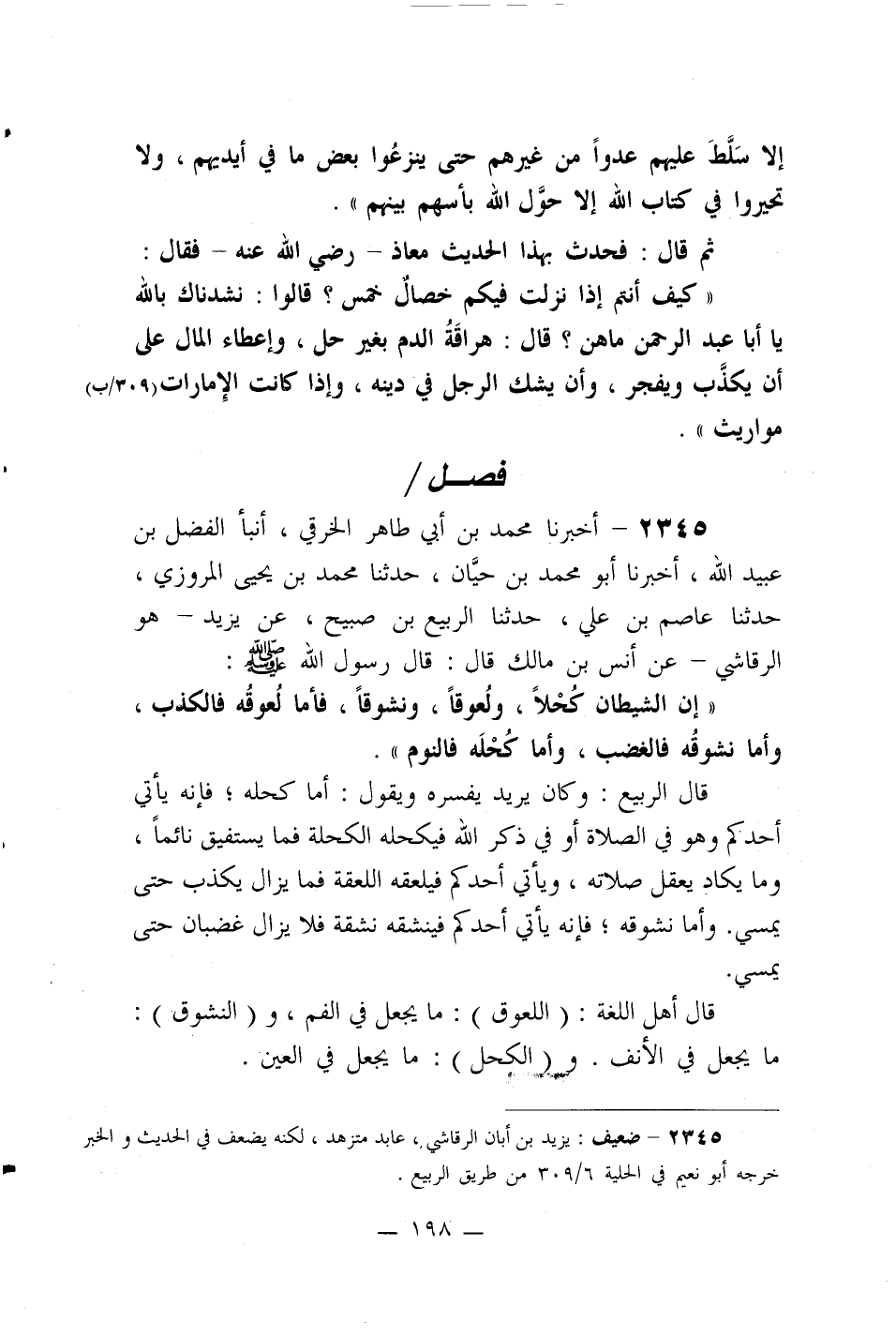 قال الربيع: وكان يريد يفسره ويقول: أما كحله؛ فإنه يأتي أحدكم وهو في الصلاة أو في ذكر الله فيكحله الكحلة فما يستفيق نائماً، وما يكاد يعقل صلاته، ويأتي أحدكم فيلعقه اللعقة فما يزال يكذب حتى يمسي. وأما نشوقه؛ فإنه يأتي أحدكم فينشقه نشقة فلا يزال غضبان حتى يمسي.