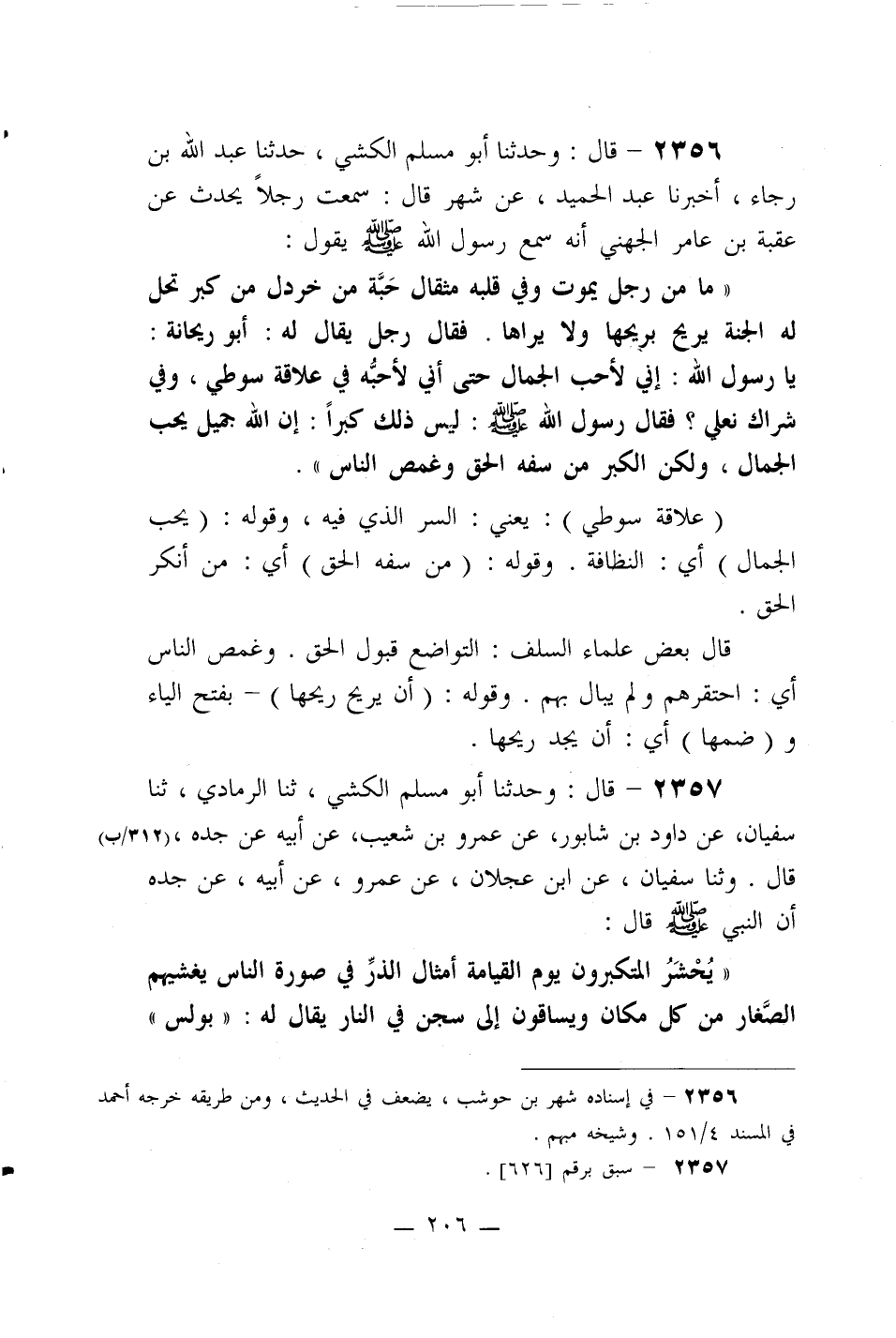 2356- قال: وحدثنا أبو مسلم الكشي، حدثنا عبد الله بن رجاء، أخبرنا عبد الحميد، عن شهر قال: سمعت رجلاً يحدث عن عقبة بن عامر الجهني أنه سمع رسول الله صلى الله عليه وسلم يقول:
