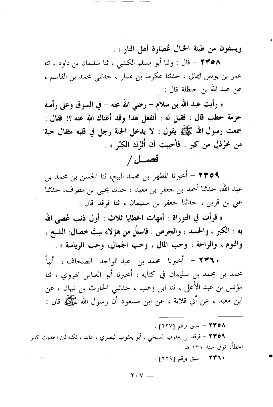 -[208]- ((ثلاث هن أصل كل خطيئة فاتقوهن واحذروهن، وثلاث إذا ذكرن فأمسكوا: إياكم والكبر، فإن إبليس إنما منعه الكبر أن يسجد لآدم وإياكم والحرص، فإن آدم إنما حمله الحرص على أن أكل من الشجرة. وإياكم والحسد، فإن ابني آدم إنما قتل أحدهما صاحبه حسداً، فهن أصل كل خطيئة فاتقوهن واحذروهن. والثلاث: إذا ذكر القدر فأمسكوا، وإذا ذكر النجوم فأمسكوا، وإذا ذكر أصحابي فأمسكوا)) .