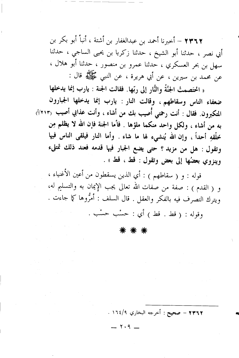 قوله: و (سقاطهم) : أي الذين يسقطون من أعين الأغنياء، و (القدم) : صفة من صفات الله تعالى يجب الإيمان به والتسليم له، ويترك التصرف فيه بالفكر والعقل. قال السلف: أمروها كما جاءت.