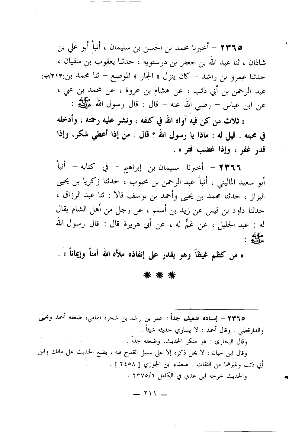 2365- أخبرنا محمد بن الحسن بن سليمان، أنبأ أبو علي بن شاذان، ثنا عبد الله بن جعفر بن درستويه، حدثنا يعقوب بن سفيان، حدثنا عمرو بن راشد –كان ينزل ((الجار)) الموضع- ثنا محمد بن عبد الرحمن بن أبي ذئب، عن هشام بن عروة، عن محمد بن علي، عن ابن عباس –رضي الله عنه- قال: قال رسول الله صلى الله عليه وسلم:
