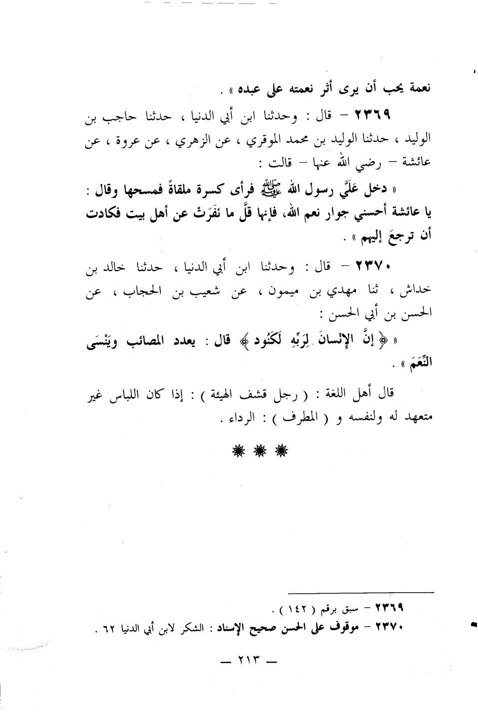 2369- قال: وحدثنا ابن أبي الدنيا، حدثنا حاجب بن الوليد، حدثنا الوليد بن محمد الموقري، عن الزهري، عن عروة، عن عائشة –رضي الله عنها- قالت: