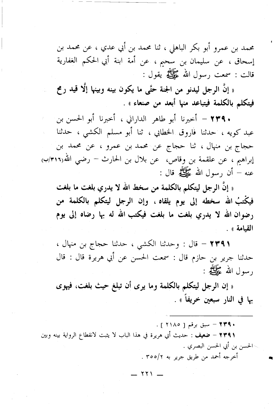 2390- أخبرنا أبو طاهر الداراني، أخبرنا أبو الحسن بن عبد كويه، حدثنا فاروق الخطابي، ثنا أبو مسلم الكشي، حدثنا حجاج بن منهال، ثنا حجاج عن محمد بن عمرو، عن محمد بن إبراهيم، عن علقمة بن وقاص، عن بلال بن الحارث –رضي الله عنه- أن رسول الله صلى الله عليه وسلم قال: