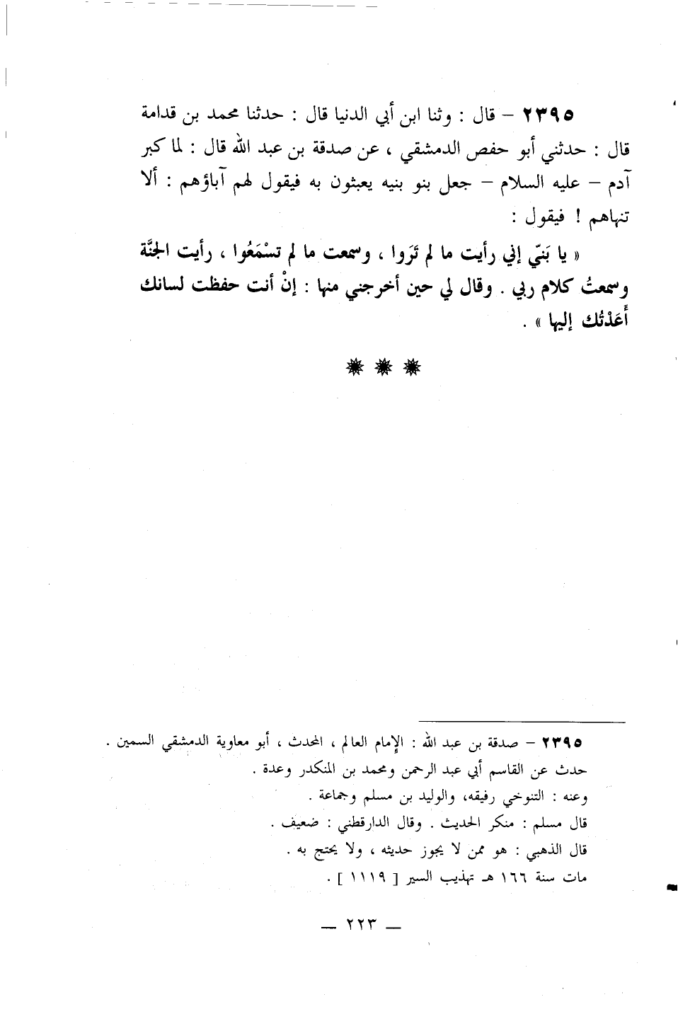 2395- قال: وثنا ابن أبي الدنيا قال: حدثنا محمد بن قدامة قال: حدثني أبو حفص الدمشقي، عن صدقة بن عبد الله قال: لما كبر آدم –عليه السلام- جعل بنو بنيه يعبثون به فيقول لهم آباؤهم: ألا تنهاهم! فيقول: