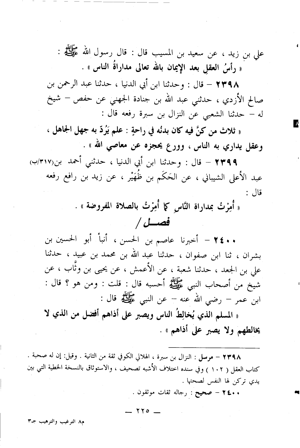 2398- قال: وحدثنا ابن أبي الدنيا، حدثنا عبد الرحمن بن صالح الأزدي، حدثني عبد الله بن جنادة الجهني عن حفص –شيخ له- حدثنا الشعبي عن النزال بن سبرة رفعه قال: