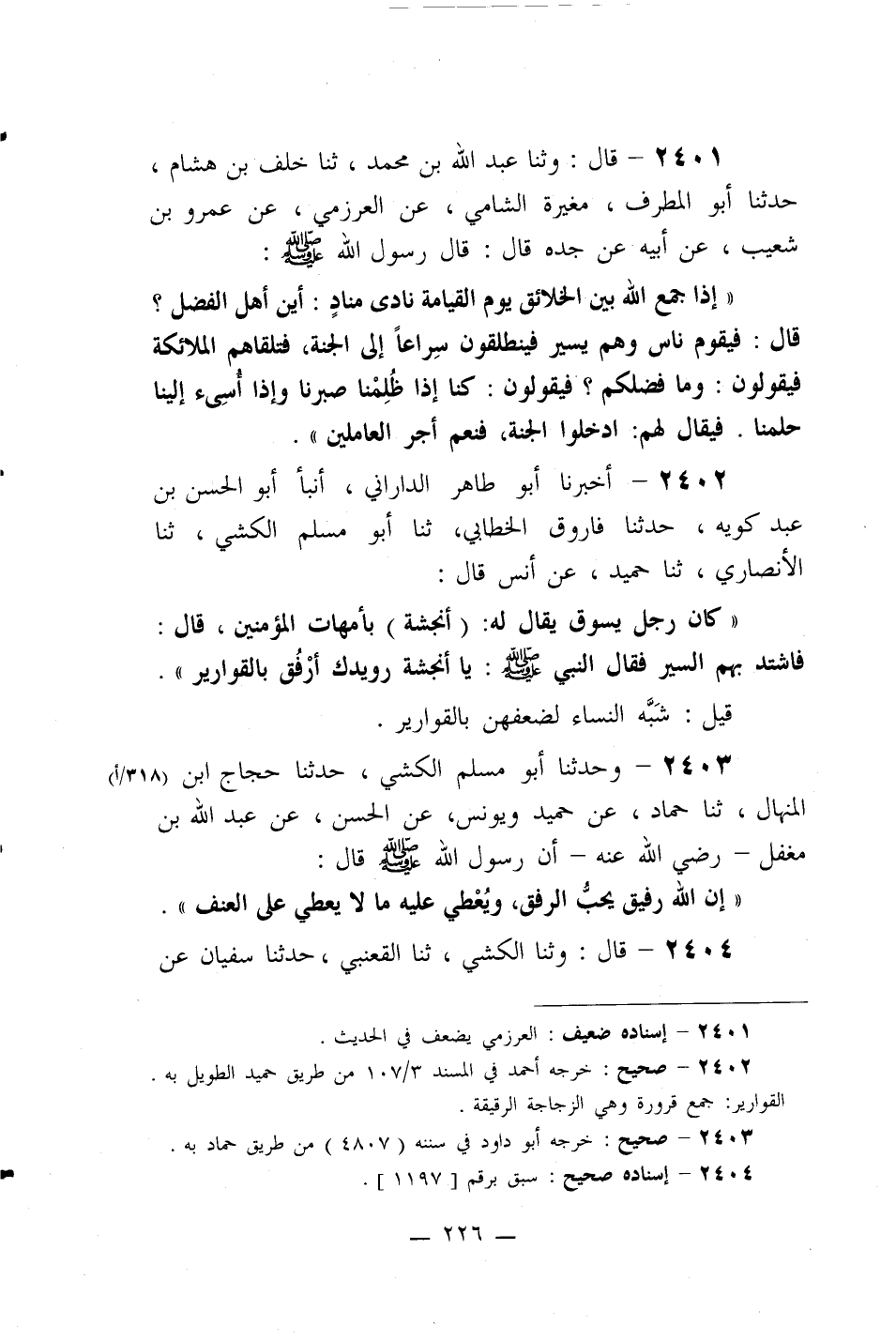 2403- وحدثنا أبو مسلم الكشي، حدثنا حجاج بن المنهال، ثنا حماد، عن حميد ويونس، عن الحسن، عن عبد الله بن مغفل –رضي الله عنه- أن رسول الله صلى الله عليه وسلم قال: