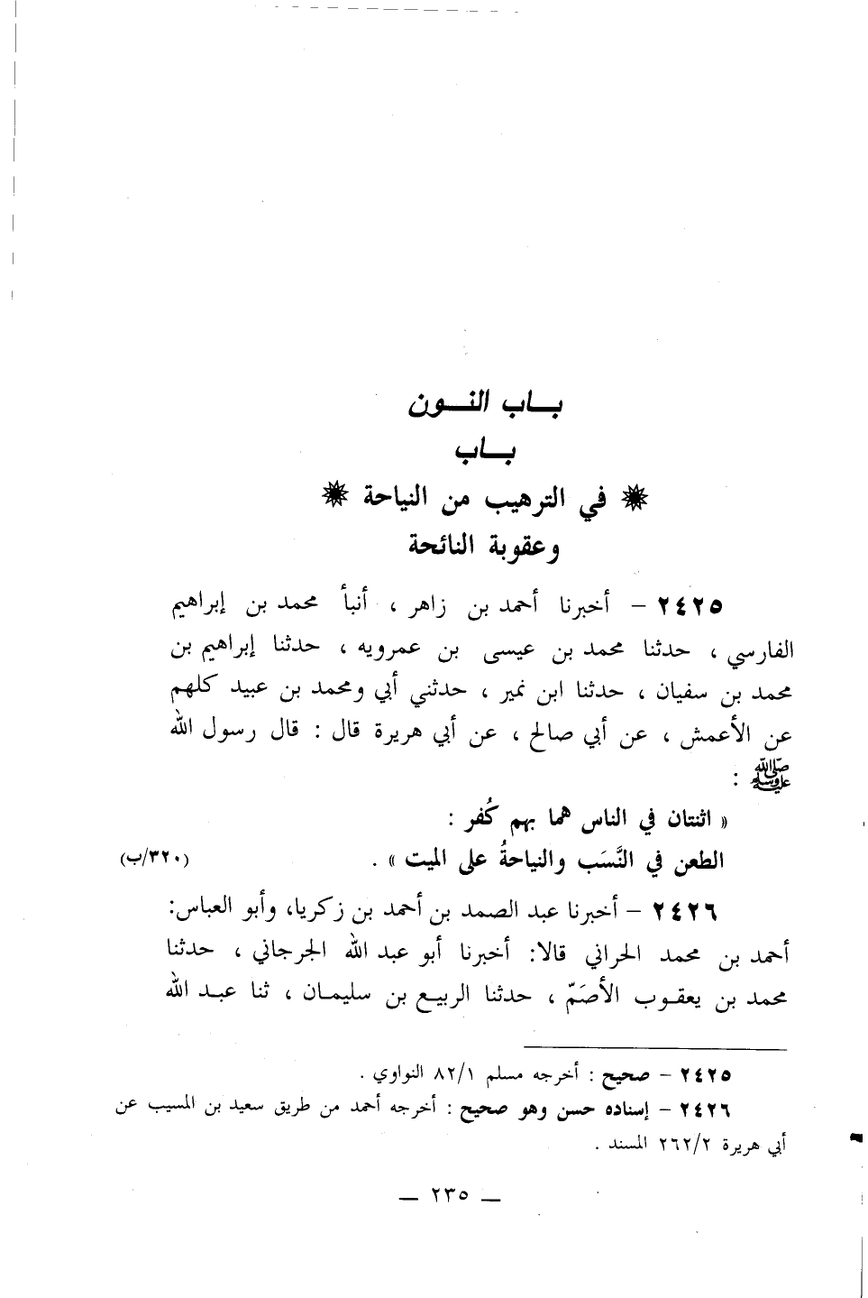 2425- أخبرنا أحمد بن زاهر، أنبأ محمد بن إبراهيم الفارسي، حدثنا محمد بن عيسى بن عمرويه، حدثنا إبراهيم بن محمد بن سفيان، حدثنا ابن نمير، حدثني أبي ومحمد بن عبيد كلهم عن الأعمش، عن أبي صالح، عن أبي هريرة قال: قال رسول الله صلى الله عليه وسلم: