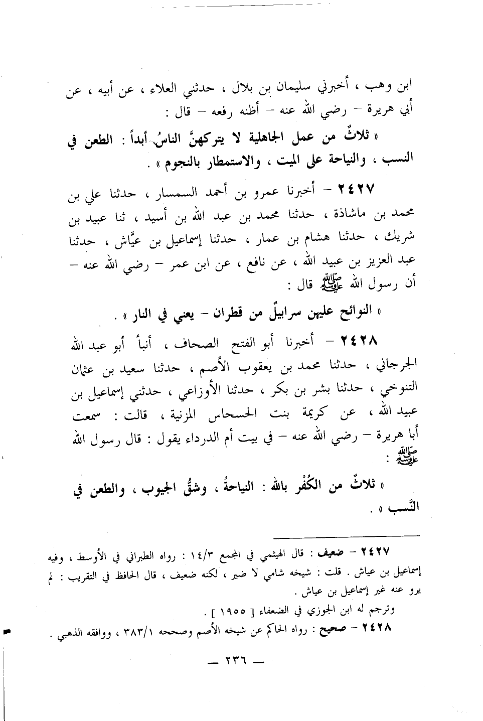 2427- أخبرنا عمرو بن أحمد السمسار، حدثنا علي بن محمد بن ماشاذة، حدثنا محمد بن عبد الله بن أسيد، ثنا عبيد بن شريك، حدثنا هشام بن عمار، حدثنا إسماعيل بن عياش، حدثنا عبد العزيز بن عبيد الله، عن نافع، عن ابن عمر –رضي الله عنه- أن رسول الله صلى الله عليه وسلم قال: