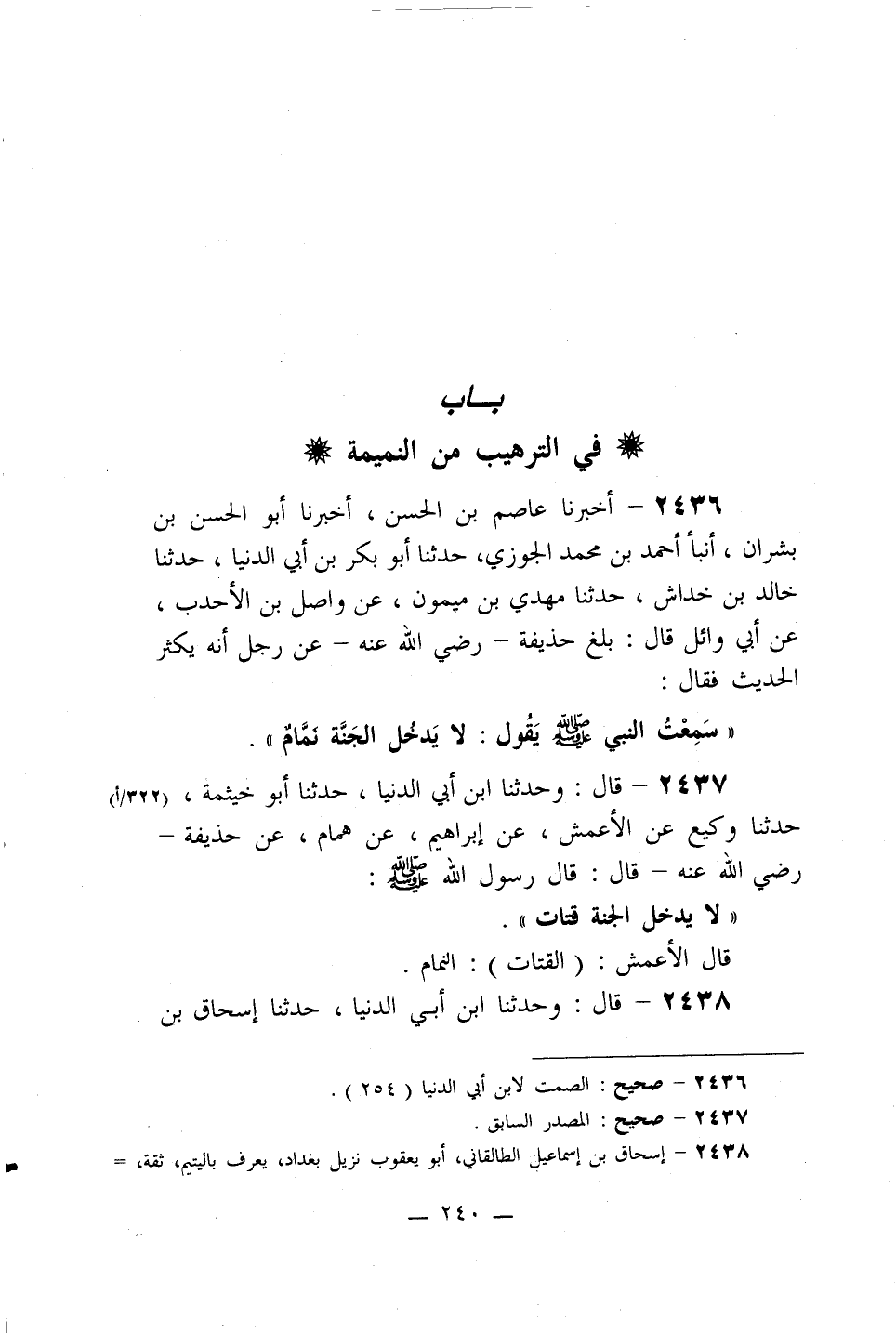 2437- قال: وحدثنا ابن أبي الدنيا، حدثنا أبو خيثمة، حدثنا وكيع عن الأعمش، عن إبراهيم، عن همام، عن حذيفة –رضي الله عنه- قال: قال رسول الله صلى الله عليه وسلم: