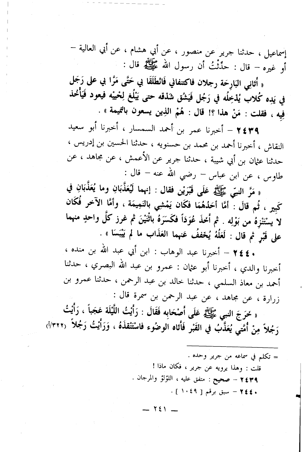 2439- أخبرنا عمر بن أحمد السمسار، أخبرنا أبو سعيد النقاش، أخبرنا أحمد بن محمد بن حسنويه، حدثنا الحسين بن إدريس، حدثنا عثمان بن أبي شيبة، حدثنا جرير عن الأعمش، عن مجاهد، عن طاوس، عن ابن عباس –رضي الله عنه- قال:
