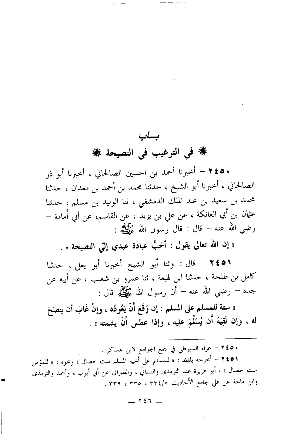 2450- أخبرنا أحمد بن الحسين الصالحاني، أخبرنا أبو ذر الصالحاني، أخبرنا أبو الشيخ، حدثنا محمد بن أحمد بن معدان، حدثنا محمد بن سعيد بن عبد الملك الدمشقي، ثنا الوليد بن مسلم، حدثنا عثمان بن أبي العاتكة، عن علي بن يزيد، عن القاسم، عن أبي أمامة –رضي الله عنه- قال: قال رسول الله صلى الله عليه وسلم: