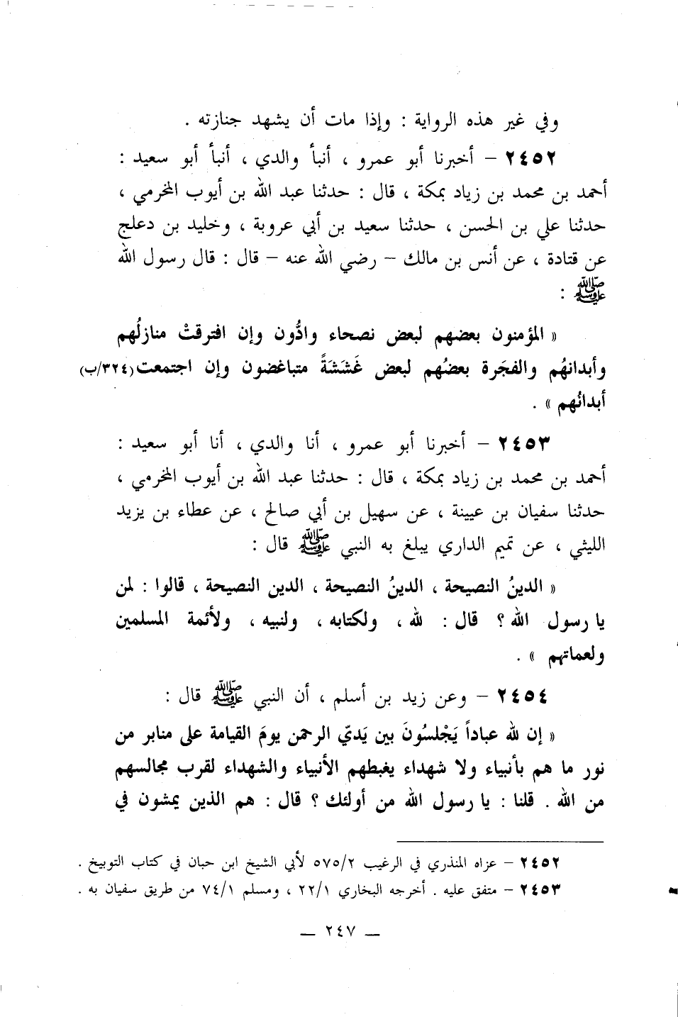 2452- أخبرنا أبو عمرو، أنبأ والدي، أنبأ أبو سعيد: أحمد بن محمد بن زياد بمكة، قال: حدثنا عبد الله بن أيوب المخرمي، حدثنا علي بن الحسن، حدثنا سعيد بن أبي عروبة، وخليد بن دعلج عن قتادة، عن أنس بن مالك –رضي الله عنه- قال: قال رسول الله صلى الله عليه وسلم: