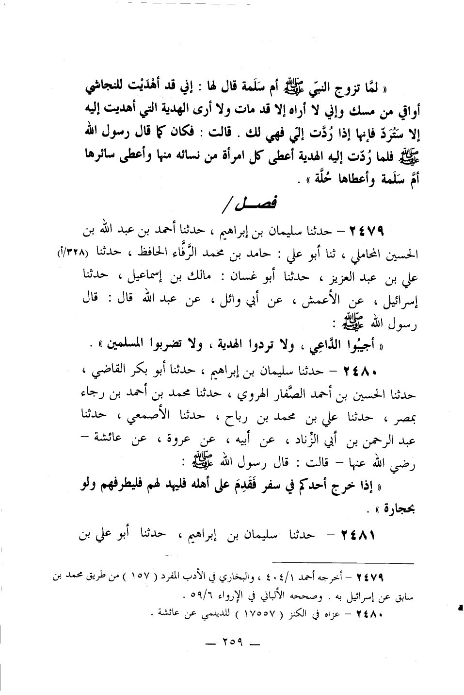 2479- حدثنا سليمان بن إبراهيم، حدثنا أحمد بن عبد الله بن الحسين المحاملي، ثنا أبو علي: حامد بن محمد الرفاء الحافظ، حدثنا علي بن عبد العزيز، حدثنا أبو غسان: مالك بن إسماعيل، حدثنا إسرائيل، عن الأعمش، عن أبي وائل، عن عبد الله قال: قال رسول الله صلى الله عليه وسلم: