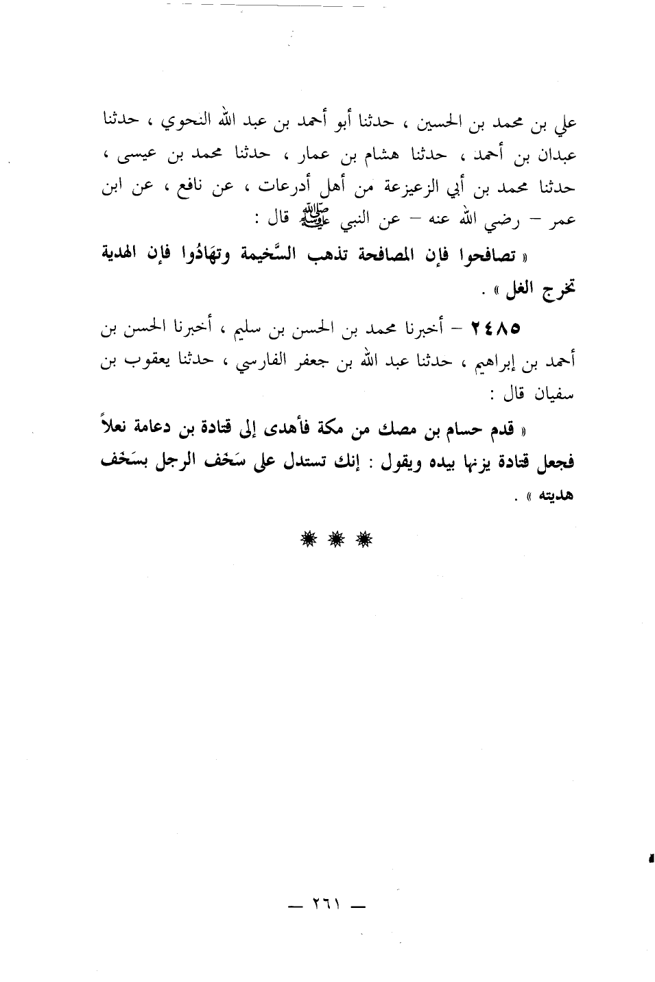 2485- أخبرنا محمد بن الحسن بن سليم، أخبرنا الحسن بن أحمد بن إبراهيم، حدثنا عبد الله بن جعفر الفارسي، حدثنا يعقوب بن سفيان قال:
