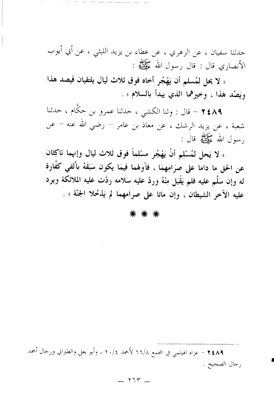 ((لا يحل لمسلم أن يهجر مسلماً فوق ثلاث ليال وإنهما ناكثان عن الحق ما داما على صرامهما، فأولهما فيما يكون سبقهُ بألفي كفارة له وإن سلّم عليه فلم يقبل منه وردّ عليه سلامه ردّت عليه الملائكة ويرد عليه الآخر الشيطان، وإن ماتا على صرامهما لم يدخلا الجنة)) .