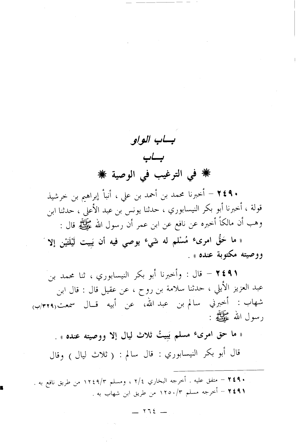 قال أبو بكر النيسابوري: قال سالم: (ثلاث ليال) وقال -[265]- نافع: (ليلتين) . قال الشافعي في معنى الحديث: ما الحزم لامرئ مسلم أن يبيت ليلتين إلا ووصيته مكتوبة عنده، يريد أن من صواب الأمر للمرء أن لا تفارقه وصيته.