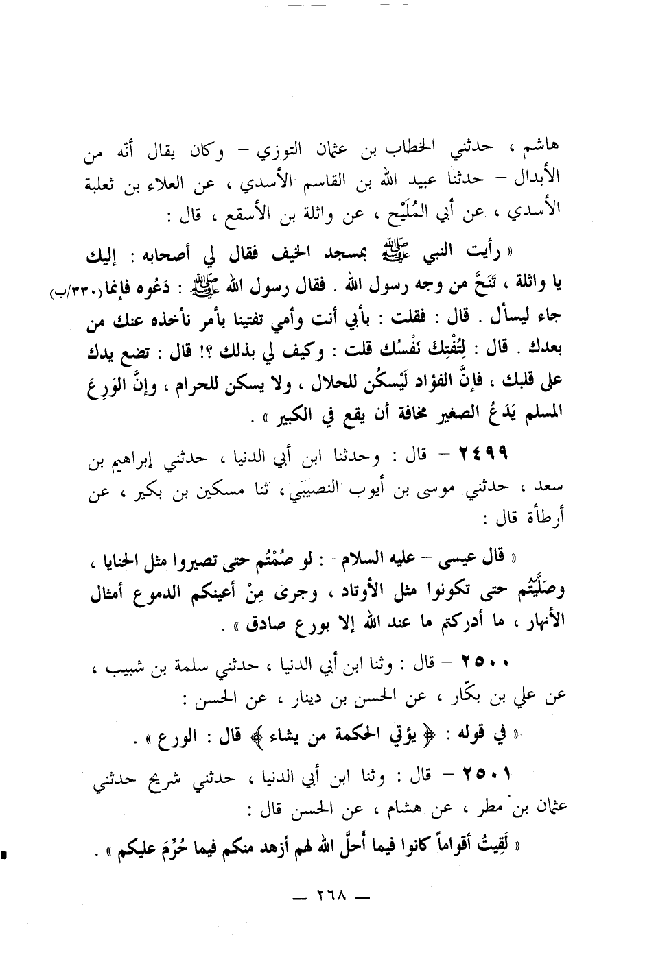 2500- قال: وثنا ابن أبي الدنيا، حدثني سلمة بن شبيب، عن علي بن بكار، عن الحسن بن دينار، عن الحسن: